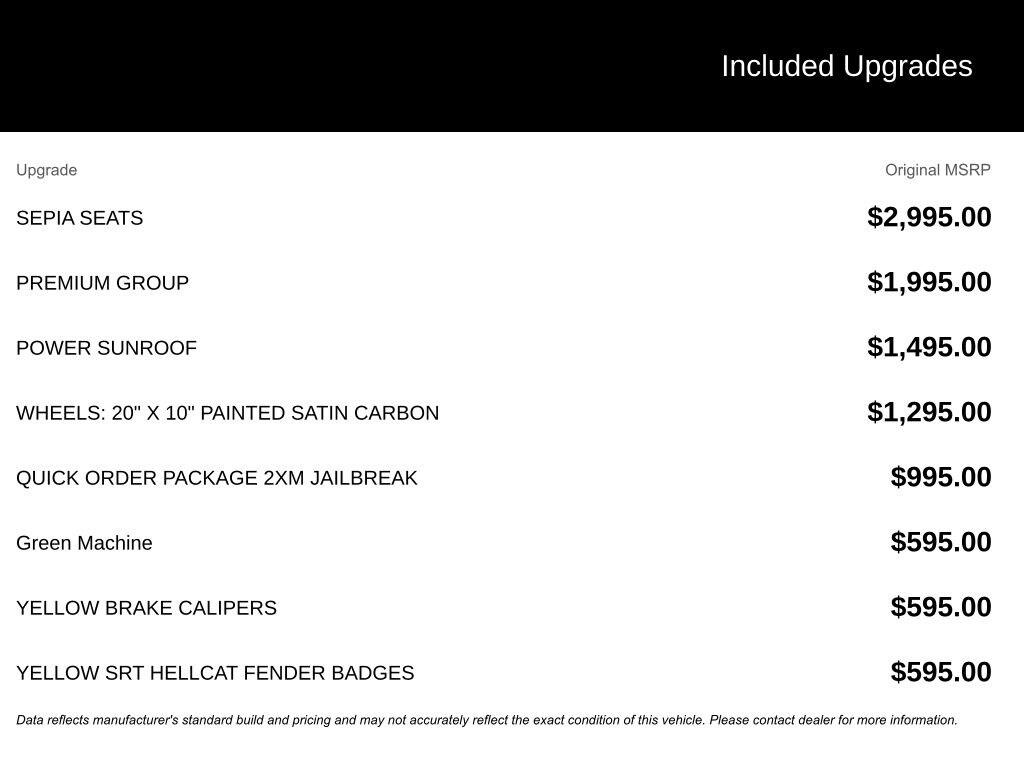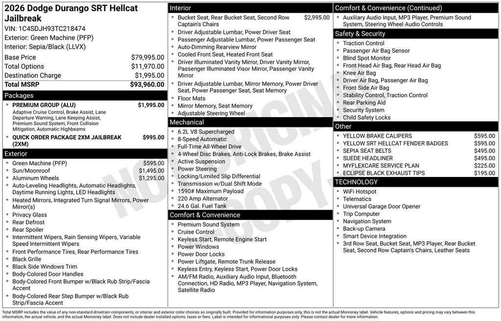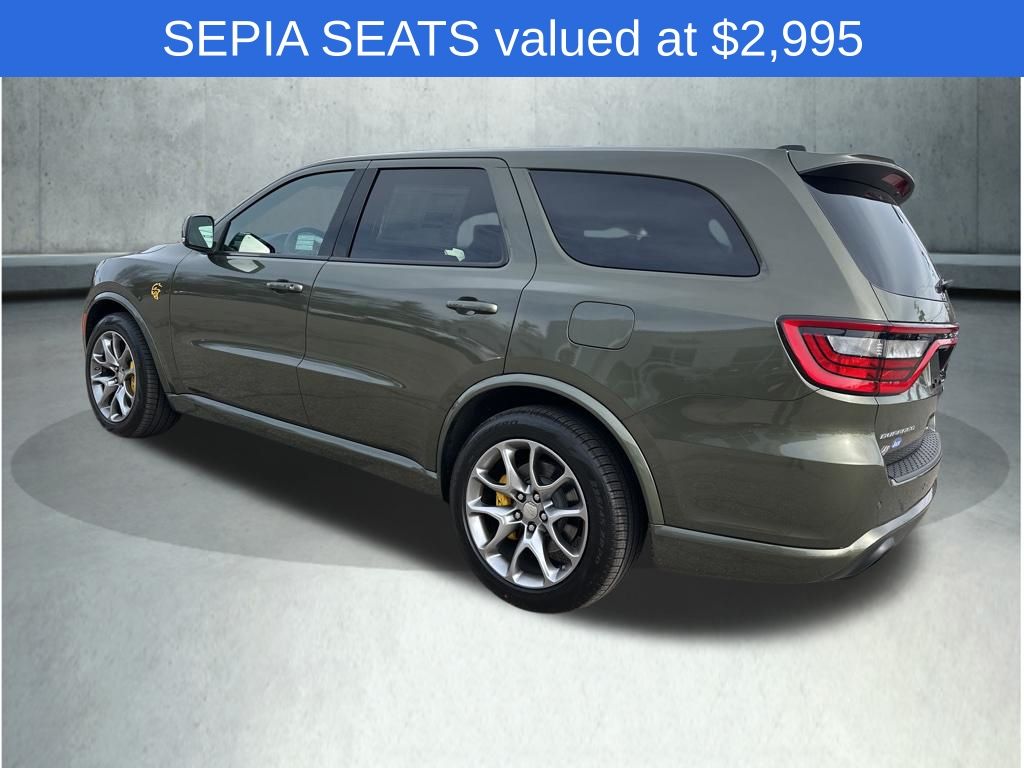 Green Machine 2026 Dodge Durango SRT Hellcat 8-Speed Automatic AWD, 19 Harman/Kardon Amplified Speakers with Subwoofer, 2nd Row Fold/Tumble Captain Chairs, 825 Watt Amplifier, Adaptive Cruise Control with Stop, Adaptive suspension, Advanced Brake Assist, Apple CarPlay/Android Auto, Auto High Beam Headlamp Control, Automatic temperature control, Eclipse Black Exhaust Tips, Electronic Stability Control, Forged Carbon Fiber Interior Accents, Four wheel independent suspension, Full Speed Forward Collision Warning Plus, Fully automatic headlights, Heated front seats, Heated rear seats, Heated steering wheel, Illuminated entry, Jailbreak Badge, Lane Departure Warning Plus, Leather Trimmed Bucket Seats, Memory seat, Navigation System, ParkView Rear Back-Up Camera, Power Liftgate, Power Sunroof, Premium Door Trim Panel, Premium Group, Premium Instrument Panel, Quick Order Package 2XM Jailbreak, Rear air conditioning, Rear window defroster, Remote keyless entry, Spoiler, Supercharged Sill Plate, Traction control, Ventilated front seats, Wheels: 20" x 10" Painted Satin Carbon, Yellow SRT Hellcat Fender Badges.
