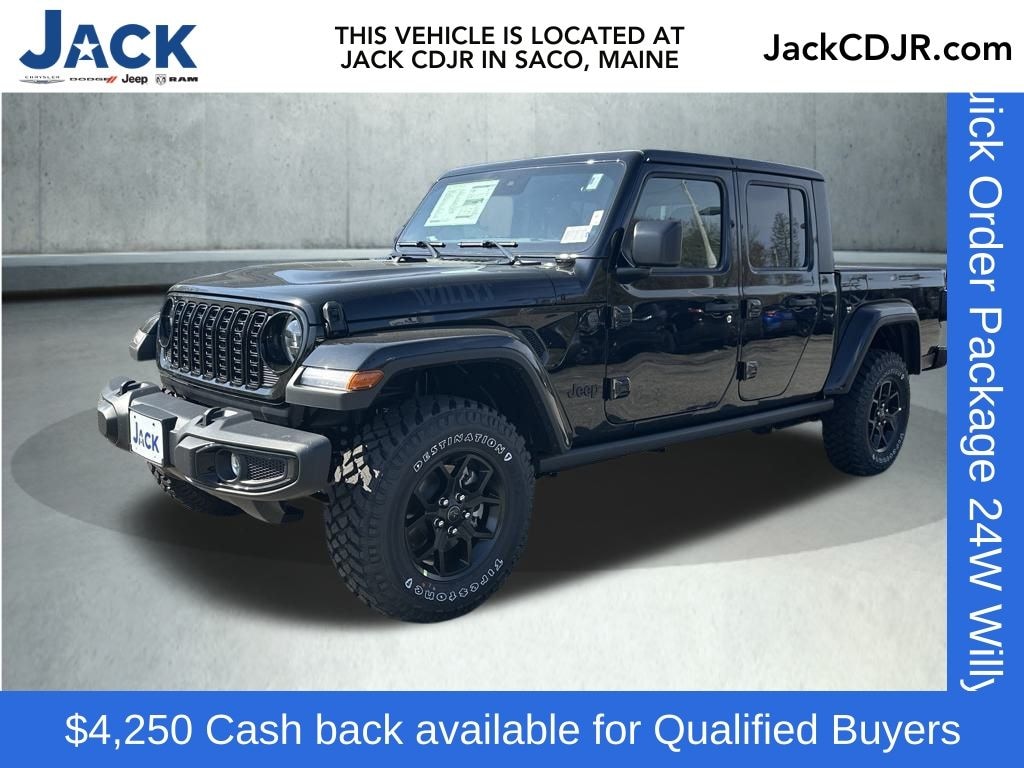 Black Clearcoat 2025 Jeep Gladiator Willys 8-Speed Automatic 4-Wheel Drive Decal, 97 MPH Vehicle Max Speed Calibration, Advanced Brake Assist, Air Conditioning w/Auto Temperature Control, Automatic Headlamps, Auxiliary Switches, Black Grille, Body Color Fender Flares (2-Piece), Class IV Receiver Hitch, Cluster 7.0" TFT Color Display, Convenience Group, Corning Gorilla Glass, Daytime Running Lamp System, Daytime Running Lamps LED Accents, Deep Tint Sunscreen Windows, E-Locker Rear Axle, Emergency/Assistance Call, Enhanced Adaptive Cruise Control, Front Door Locks 2-Door Passive Entry, Front fog lights, Front Heavy Duty Red Accent Shock Absorbers, Front LED Fog Lamps, Full Speed Forward Collision Warning Plus, Heated Front Seats, Heated Steering Wheel, Heavy-Duty Engine Cooling, LED Premium Reflector Headlamps, LED Taillamps, Mold In Color Bumper w/Gloss Black, MOPAR All-Weather Slush Mats, Off-Road Plus Mode, ParkView Rear Back-Up Camera, Power Heated Mirrors, Premium Wrapped Steering Wheel, Protection Sill Rails, Quick Order Package 24W Willys, Radio: Uconnect 5 w/12.3" Display, Rear Heavy Duty Red Accent Shock Absorbers, Remote Start System, Security Alarm, Sun Visors w/Illuminated Vanity Mirrors, Trailer Hitch Zoom, Universal Garage Door Opener, Wheels: 17" x 7.5" Painted Black, Willys Hood Decal, Willys Suspension. Price includes: $2000 - 2025 National Black Friday Select Inventory Bonus Cash. Exp. 12/01/2025 $2250 - 2025 National Bonus Cash . Exp. 12/01/2025