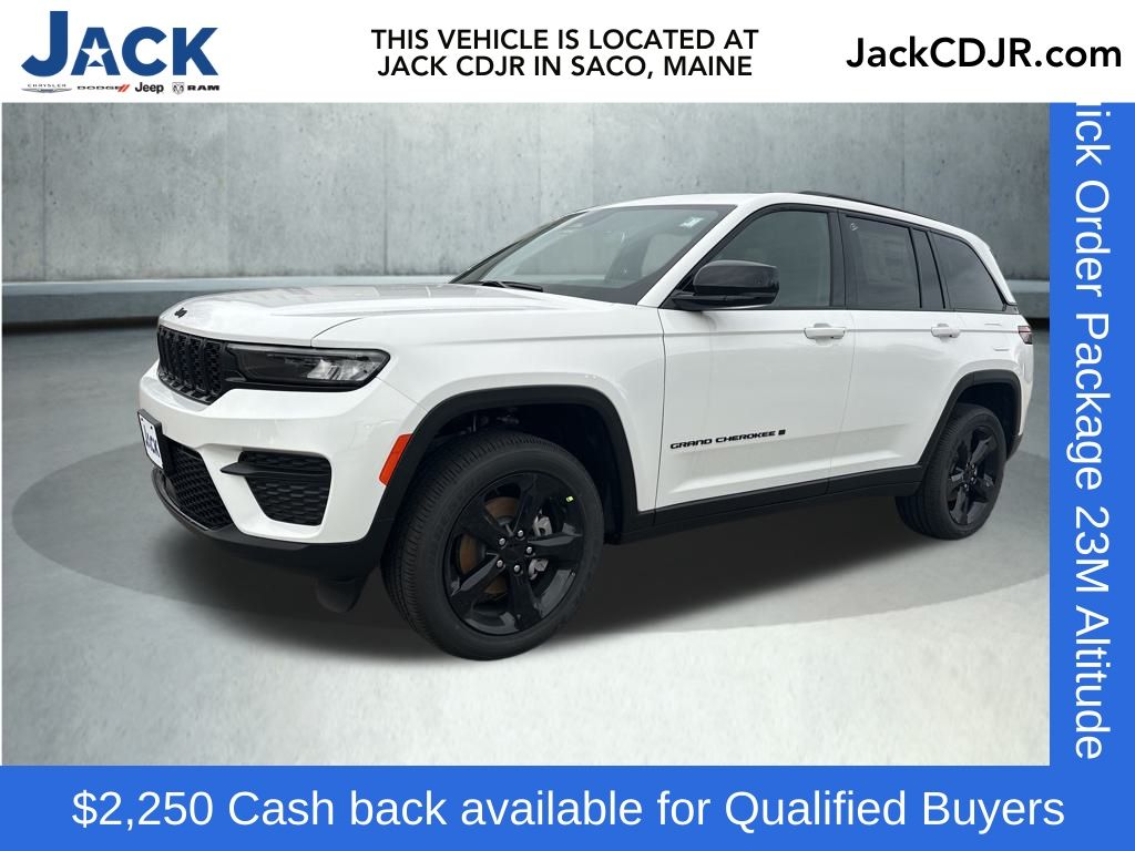 Bright White Clearcoat 2025 Jeep Grand Cherokee Altitude X 8-Speed Automatic 4WD, 115V Auxiliary Power Outlet, 180 Amp Alternator, 7 & 4-Pin Wiring Harness, Altitude X, Automatic Headlamp Levelling System, Black Headliner, Capri Leatherette/Suede Seats, Class IV Receiver Hitch, Delete Laredo Badge, Electronic Stability Control, Fully automatic headlights, Gloss Black Exterior Accents, Heated Front Seats, Heated Steering Wheel, Heavy-Duty Engine Cooling, ParkView Rear Back-Up Camera, Power Liftgate, Power Sunroof, Quick Order Package 23M Altitude X, Radio: Uconnect 5 w/8.4" Display, Rain Sensitive Windshield Wipers, Rear Load Levelling Suspension, Remote Start System, Security system, Selectable Tire Fill Alert, Traction control, Trailer Hitch Zoom, Trailer Tow Package, Wheels: 18" x 8" Fully Painted Aluminum 1, Wheels: 20" x 8.5" Gloss Black Painted Aluminum, Wireless Charging Pad. 19/26 City/Highway MPG Price includes: $2250 - 2025 National Retail Bonus Cash . Exp. 03/02/2026