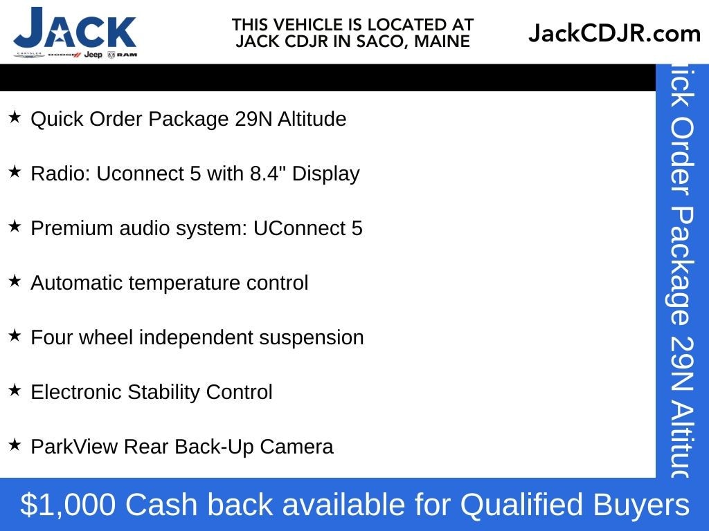 diamond black crystal pearlcoat 2026 Jeep Compass Latitude 8-Speed Automatic 4WD, 10.1" Touchscreen Display, Altitude Special Edition, Automatic temperature control, Black Day Light Opening Moldings, Electronic Stability Control, Four wheel independent suspension, Front fog lights, Gloss Black Surround/Neutral Gray Rings, Heated front seats, Neutral Gray Exterior Badging, ParkView Rear Back-Up Camera, Piano Black Interior Accents, Premium audio system: UConnect 5, Quick Order Package 29N Altitude, Radio: Uconnect 5 with 8.4" Display, Sliding Sun Visors with Illuminated Mirrors, Wheels: 18" x 7" Gloss Black Painted Aluminum. 23/31 City/Highway MPG Price includes: $1000 - 2026 National Retail Bonus Cash . Exp. 02/02/2026