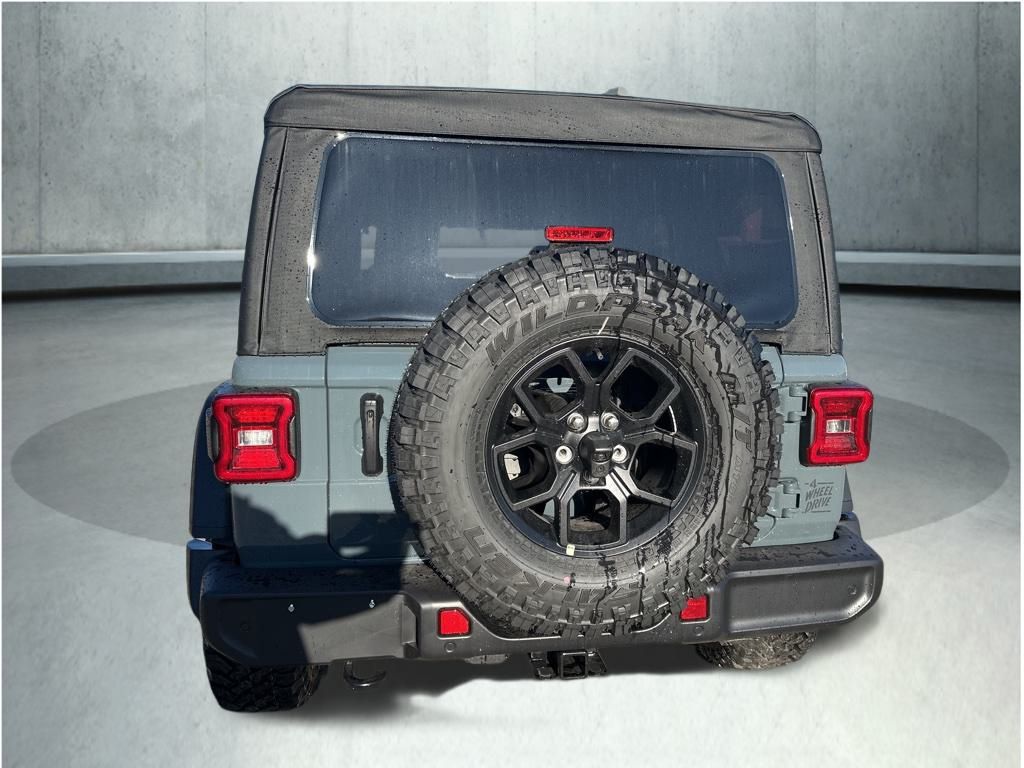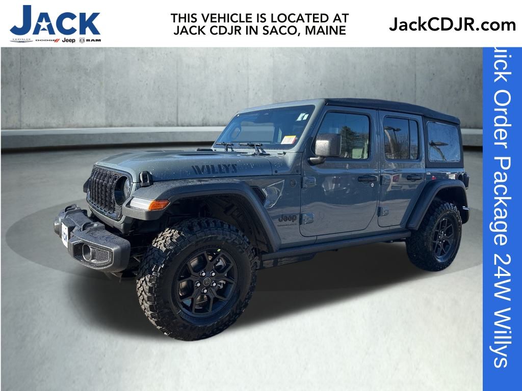 Anvil Clear Coat 2026 Jeep Wrangler Willys 8-Speed Automatic 2-Door Passive Entry, Front Door Locks, 4-Wheel Drive Swing Gate Decal, 4.10 Rear Axle Ratio, 7 and 4 Pin Wiring Harness, Advanced Brake Assist, Air Conditioning with Auto Temp Control, Air Filtering, Auto High Beam Headlamp Control, Automatic Headlamps, Auxiliary Switches, Black Grille with Gloss Black Rings, Blind Spot and Cross Path Detection, Class II Receiver Hitch, Cluster 7.0" TFT Color Display, Convenience Group, Conventional Differential Front Axle, Corning Gorilla Glass, Dana M210 Wide HD Tube Front Axle, Dana M220 Wide Rear Axle, Daytime Running Lamps LED Accents, Deep Tint Sunscreen Windows, E-Locker Rear Axle, Electronic Stability Control, Emergency/Assistance Call, Enhanced Adaptive Cruise Control, Front LED Fog Lamps, Full Speed Forward Collision Warning Plus, Heated Front Seats, Heated Steering Wheel, Injection Molded Black Rear Bumper, LED Premium Reflector Headlamps, LED Taillamps, Mold in Color Bumper with Gloss Black, Molded in Color Rubicon Highline Flare, MOPAR All-Weather Floor Mats, Off-Road Plus Mode, Overhead airbag, Panic alarm, ParkSense Rear Park Assist System, Power Dome Dual Vented Hood, Power Heated Mirrors, Premium Wrapped Steering Wheel, Quick Order Package 24W Willys, Radio: Uconnect 5 with 12.3" Display, Safety Group, Security Alarm, Steel Power Dome Hood Package, Sun Visors with Illuminated Vanity Mirrors, Universal Garage Door Opener, Wheels: 17" x 7.5" Painted Black, Willy's Suspension, Willys Hood Decal.