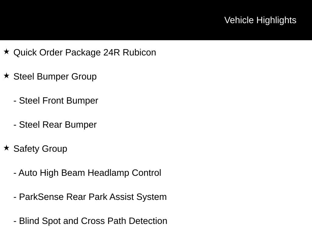 reign 2026 Jeep Wrangler Rubicon 8-Speed Automatic 12.3" Touchscreen Display, 4G LTE Wi-Fi Hot Spot, Apple CarPlay, Auto High Beam Headlamp Control, Auto-Dimming Rear-View Mirror, Blind Spot and Cross Path Detection, Body Color 3-Piece Hard Top, Connected Travel and Traffic Services, Connectivity - US/Canada, Convenience Group, Electronic Stability Control, For More Info, Call 800-643-2112, Freedom Panel Storage Bag, Front fog lights, Fully automatic headlights, Google Android Auto, GPS Navigation, HD Radio, Heated Front Seats, Heated Steering Wheel, Integrated Center Stack Radio, Integrated Off-Road Camera, Integrated Voice Command with Bluetooth, MOPAR Stainless Door Sill Guards, No Soft Top, Overhead airbag, ParkSense Rear Park Assist System, Performance Suspension, Quick Order Package 24R Rubicon, Radio: Uconnect 5 Navigation with 12.3" Display, Rear Window Defroster, Rear Window Wiper/Washer, Remote keyless entry, Safety Group, Security system, SiriusXM Radio Service, SiriusXM with 360L, Steel Bumper Group, Steel Front Bumper, Steel Rear Bumper, Steering wheel mounted audio controls, Technology Group, Traction control, Universal Garage Door Opener.