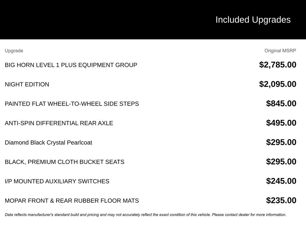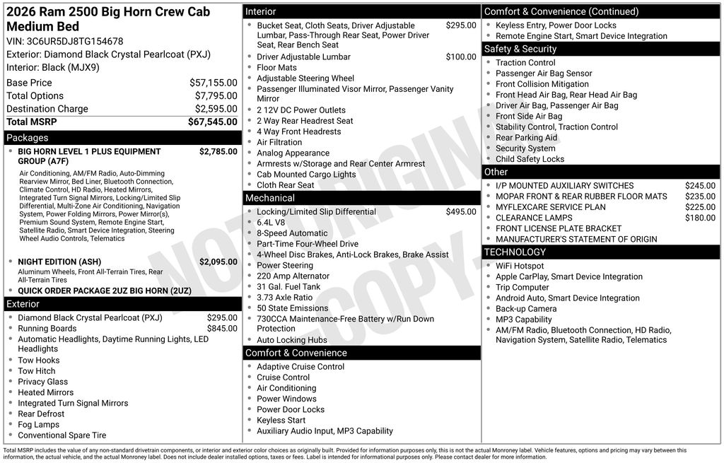 Diamond Black Crystal Pearlcoat 2026 Ram 2500 Big Horn 8-Speed Automatic 12" Touchscreen Display, 2 Way Rear Headrest Seat, 2nd Row in Floor Storage Bins, 4 Way Front Headrests, 40/20/40 Split Bench Seat, 4G LTE Wi-Fi Hot Spot, 9 Alpine Speakers with Subwoofer, Air Conditioning ATC with Dual Zone Control, Alexa Built-in, Anti-Spin Differential Rear Axle, Apple CarPlay, Auto Power-Folding Mirrors, Auto-Dimming Rear-View Mirror, Big Horn Level 1 Plus Equipment Group, Black Exterior Mirrors, Black Exterior Truck Badging, Black Interior Accents, Black Wheel Center Hub, Body Color Grille-Surround, Connected Travel and Traffic Services, Connectivity - US/Canada, Disassociated Touchscreen Display, Dual Glove Boxes, Electronic Stability Control, Emergency Vehicle Alert System (EVAS), Exterior Mirrors Courtesy Lamps, Exterior Mirrors with Heating Element, Exterior Mirrors with Supplemental Signals, Foam Bottle Insert (door Trim Panel), Folding Flat Load Floor Storage, Footwell Courtesy Lamp, For Details, Visit DriveUconnect.com, For More Info, Call 800-643-2112, Forward and Reverse Utility Lights, Front Armrest with Cupholders, Front Center Seat Cushion Storage, Front Seat Back Map Pockets, Fully automatic headlights, Global Telematics Box Module, Gloss Black Nostrils/Mic Black Grille, Glove Box Lamp, Google Android Auto, GPS Antenna Input, GPS Navigation, HD Radio, Integrated Voice Command with Bluetooth, LED Bed Lighting, Locking Lower Glove Box, Luxury Steering Wheel, Manual Adjust 4-Way Front Passenger Seat, Mirror Running Lights, MOPAR Deployable Bed Step, MOPAR Spray in Bedliner, Night Edition, Off-Road Info Pages, Painted Front Bumper, Painted Rear Bumper, ParkView Rear Back-Up Camera, Power 2-Way Driver Lumbar Adjust, Power Adjust 8-Way Driver Seat, Power Adjust Mirrors, Power Heated Folding Telescopic Mirrors, Power Telescoping Mirrors, Power-Adjustable Convex Aux Mirrors, Premium Cloth 40/20/40 Bench Seat, Radio: Uconnect 5 Navigation with 12.0" Display, Rear 60/40 Folding Seat, Rear Dome with on/Off Switch Lamp, Remote Start System, Remote USB Port - Charge Only, Selectable Tire Fill Alert, SiriusXM Radio Service, SiriusXM with 360L, Steering Wheel Mounted Audio Controls, Storage Tray, Traction control, Trailer Tow Pages, Wheels: 20" x 8.0" Black Painted Aluminum. Price includes: $1000 - 2026 National Bonus Cash . Exp. 04/30/2026