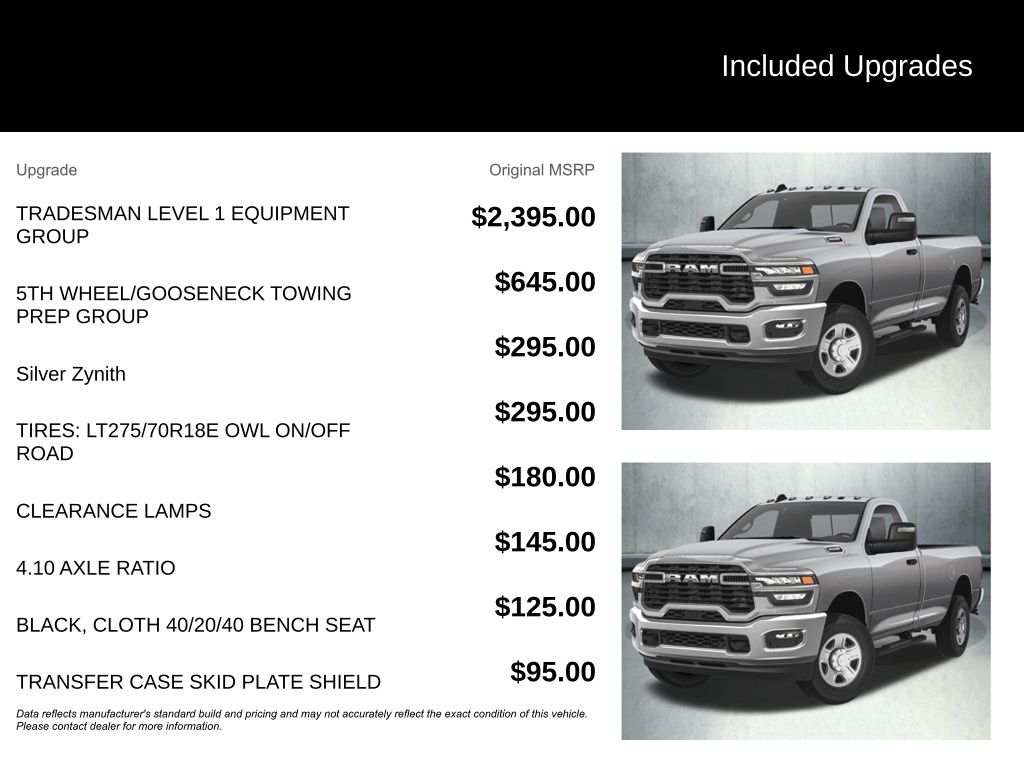 Silver Zynith 2026 Ram 3500 Tradesman 8-Speed Automatic 8 1/2' XV2 FISHER PLOW, 12" Touchscreen Display, 4 Way Front Headrests, 40/20/40 Split Bench Seat, 4G LTE Wi-Fi Hot Spot, 6 Speakers, Air Conditioning ATC with Dual Zone Control, Alexa Built-in, Apple CarPlay, Auto-Dimming Rear-View Mirror, Black Exterior Mirrors, Carpet Floor Covering, Cloth 40/20/40 Bench Seat, Commercial Features Package, Connected Travel and Traffic Services, Connectivity - US/Canada, Convenience Group, Disassociated Touchscreen Display, Electronic Stability Control, Emergency Vehicle Alert System (EVAS), Exterior Mirrors Courtesy Lamps, Exterior Mirrors with Heating Element, Exterior Mirrors with Supplemental Signals, For Details Visit DriveUconnect.com, For More Info, Call 800-643-2112, Front 1-Touch Down Power Windows, Front Armrest with Cupholders, Front Floor Mats, Front fog lights, Fully automatic headlights, Global Telematics Box Module, Google Android Auto, GPS Antenna Input, GPS Navigation, HD Radio, Integrated Voice Command with Bluetooth, Manual Adjust 4-Way Driver Seat, Manual Adjust 4-Way Front Passenger Seat, Manual Folding Exterior Mirrors, Manuarl Telescoping Mirrors, Mirror Running Lights, Mopar Black Tubular Side Steps, Off-Road Information Pages, ParkSense Front/Rear Park Assist System, Power Adjust Mirrors, Power Heat Fold Telescope Mirrors, Power-Adjustable Convex Aux Mirrors, Radio: Uconnect 5 Navigation with 12.0" Display, Rear Sliding Window, Remote Keyless Entry, Remote USB Port - Charge Only, Selectable Tire Fill Alert, SiriusXM Radio Service, SiriusXM with 360L, Speed Sensitive Power Locks, Tinted Acoustic Windshield Glass, Tradesman Level 1 Equipment Group, Trailer Tow Pages, Upgraded Door Trim Panel. Price includes: $1000 - 2026 National Bonus Cash . Exp. 03/02/2026