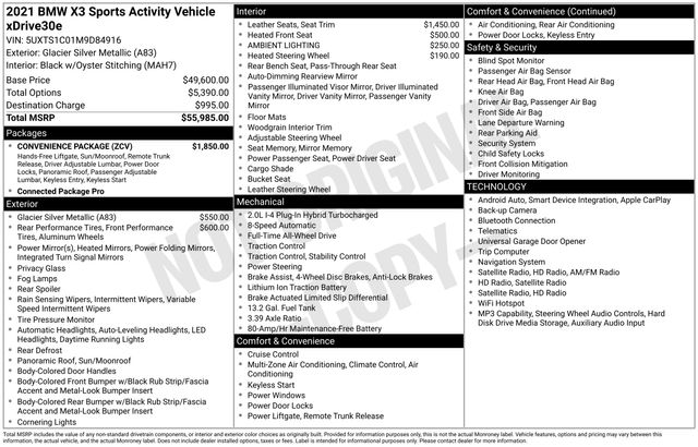 Safety is paramount in the 2021 BMW X3 xDrive30e, with features like Automatic temperature control, Front dual zone A/C, Rear air conditioning, Comfort Access Keyless Entry, Lumbar Support, Memory seat, Power driver seat, Remote keyless entry, Steering wheel mounted audio controls, Speed control, Power Liftgate, and Speed-sensing steering ensuring your peace of mind on the road.