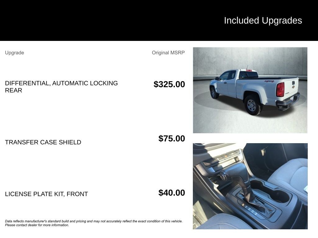 The Colorado's exterior is finished in a sleek White color, complemented by 16-inch Ultra Silver Metallic Steel wheels. This work-ready truck also features a Front License Plate Kit and Rear Step Bumper for added functionality.