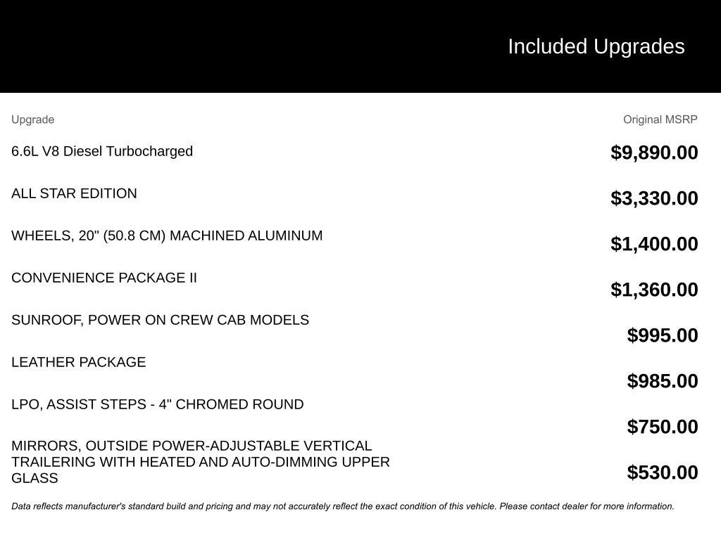 - Duramax 6.6L V8 Turbodiesel engine with 445 horsepower and an impressive 910 lb-ft of torque