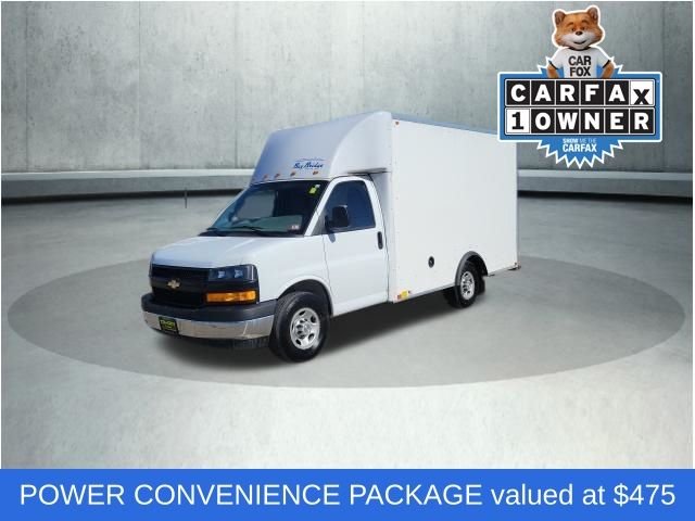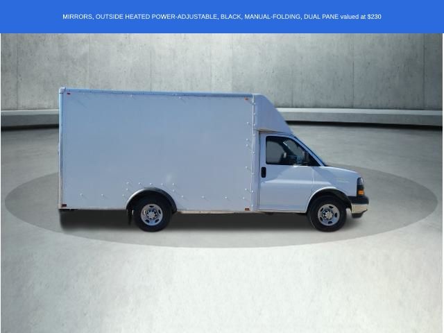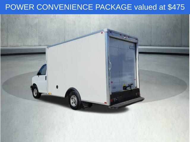 The exterior of the Express 3500 Work Van Cutaway is finished in a sleek and professional-looking white, complementing its rugged and capable design. The front chrome bumper with a step-pad enhances the vehicle's functionality, making it easy to access the cargo area.