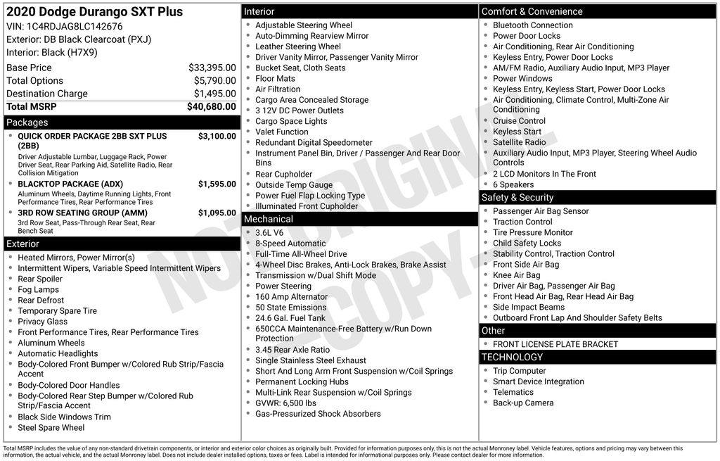 2020 Dodge Durango SXT Plus AWD, 2nd Row 60/40 Fold & Tumble Seat, 3rd Row Remote Headrest Dumping, 3rd Row Seat, 3rd Row Seating Group, 4-Way Power Driver Lumber Adjust, 7-Passenger Seating, Automatic temperature control, Black Headlamp Bezels, Blacktop Package, Body Color Front Fascia, Body Color Rear Fascia, Body Color Shark Fin Antenna, Body Color Sill Molding, Body Color Wheel Lip Moldings, Brake assist, Bright Side Roof Rails, Comfort Seating Group, Delete Roof Rack, Dual Rear Exhaust w/Bright Tips, Electronic Stability Control, Gloss Black Badges, Gloss Black Exterior Mirrors, Gloss Black Grille, Integrated Roof Rail Crossbars, LED Daytime Running Headlamps, Panic alarm, ParkSense Rear Park Assist w/Stop, ParkView Rear Back-Up Camera, Power 8-Way Driver/Manual Passenger Seat, Quick Order Package 2BB SXT Plus, Radio: Uconnect 4 w/7" Display, SiriusXM Satellite Radio, Speed control, Wheels: 20" x 8.0" High Gloss Black Aluminum. Clean CARFAX.
