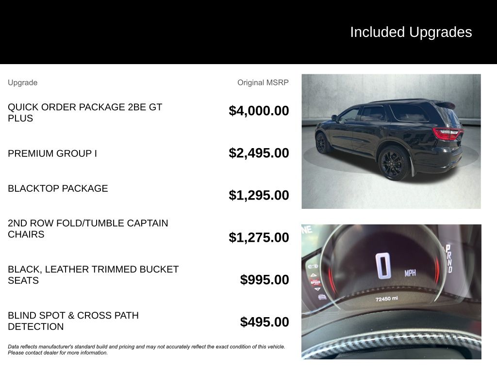 2021 Dodge Durango GT Plus AWD, 115V Auxiliary Power Outlet, 180 Amp Alternator, 506 Watt Amplifier, 9 Alpine Amplified Speakers w/Subwoofer, Auto-Dimming Exterior Driver Mirror, Automatic temperature control, Blacktop Package, Delay-off headlights, Exterior Mirrors w/Memory, Exterior Mirrors w/Supplemental Signals, Front dual zone A/C, Front fog lights, Fully automatic headlights, GPS Navigation, Heated Front Seats, Heated Second Row Seats, Heated Steering Wheel, Leather Suede Bucket Seats, Panic alarm, ParkView Rear Back-Up Camera, Power 8-Way Driver Memory 6-Way Passenger Seats, Power Driver/Passenger 4-Way Lumbar Adjust, Power Liftgate, Power Sunroof, Premium Group I, Quick Order Package 2BE GT Plus, Radio: Uconnect 5 Nav w/10.1" Display, Radio/Driver Seat/Mirrors Memory, Rear air conditioning, Remote Start System, SiriusXM Satellite Radio, Speed control, Wheels: 20" x 8.0" Black Noise Aluminum. Clean CARFAX.