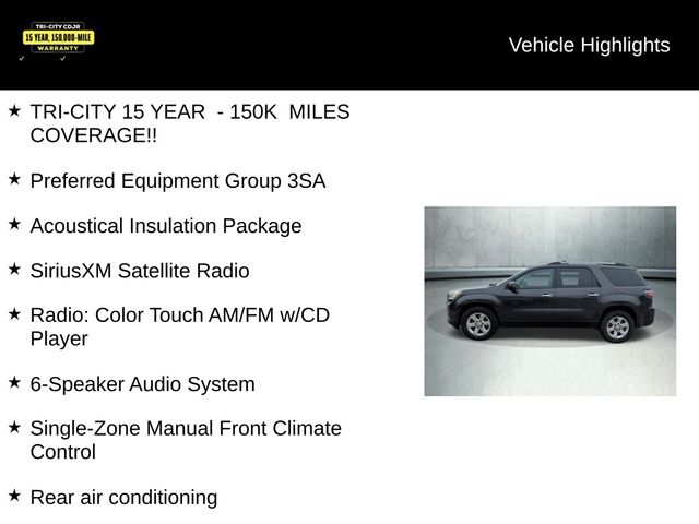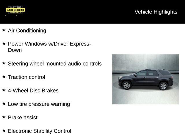Discover the exceptional value and versatility of this 2015 GMC Acadia SLE-1. With its impressive 3.6L V6 SIDI engine, 6-speed automatic transmission, and all-wheel drive, this Acadia delivers a dynamic and confident driving experience. Boasting an EPA-estimated 16 city/23 highway MPG, this SUV balances power and efficiency to meet your everyday needs.