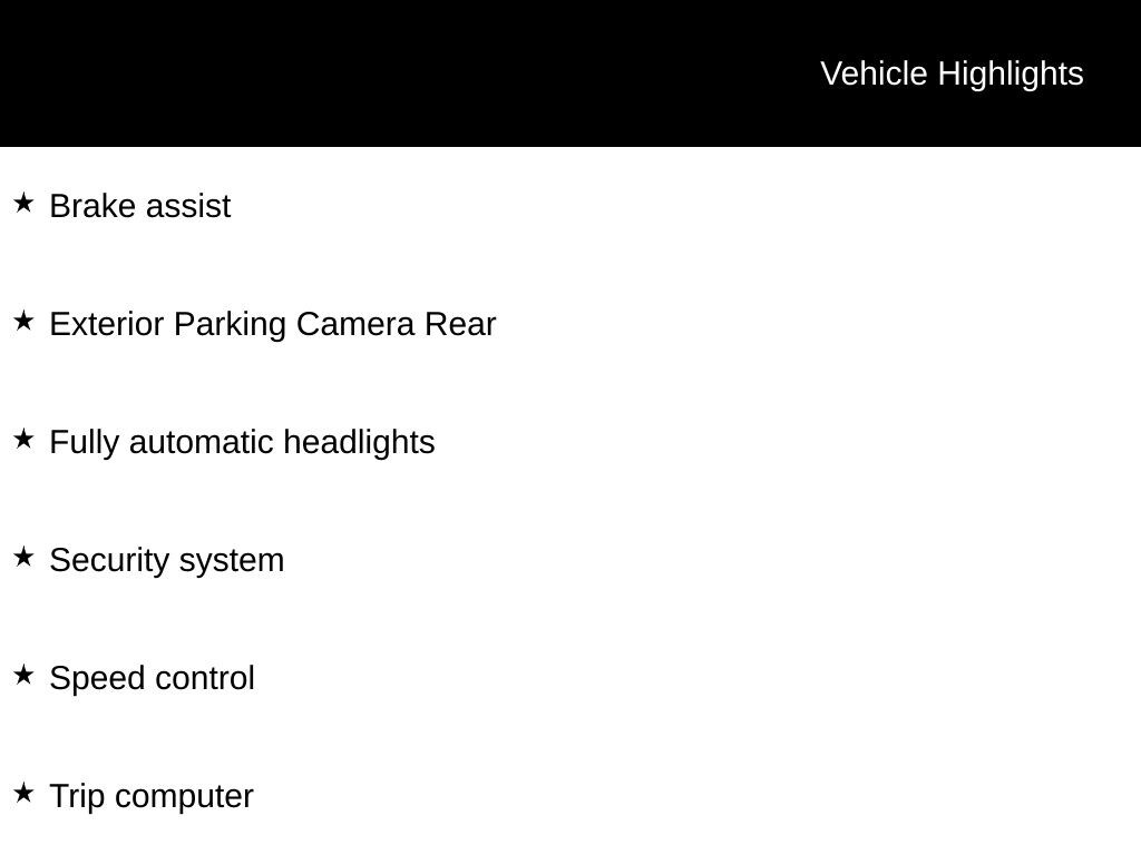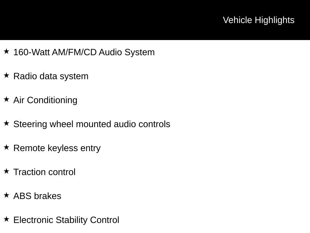 - 160-Watt AM/FM/CD Audio System - Radio data system - Air Conditioning - Remote keyless entry - Steering wheel mounted audio controls - Speed control - Brake assist - Electronic Stability Control - Traction control - Fully automatic headlights - Trip computer - Exterior Parking Camera Rear - ABS brakes - Security system