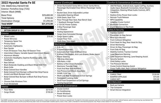 Boasting a sleek, Gray exterior and a spacious, well-appointed interior, the Santa Fe SE offers the perfect balance of form and function. Its 2.5L I4 engine, paired with an 8-Speed Automatic with SHIFTRONIC transmission and All-Wheel Drive, delivers a responsive and confident performance, while the impressive fuel economy of 22 city/25 highway MPG* ensures you can go further on every tank.