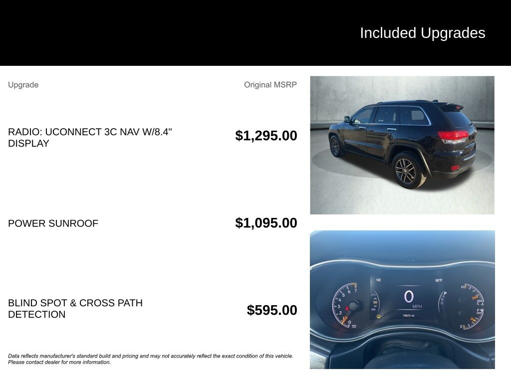 2017 Jeep Grand Cherokee Limited 4WD, 8.4" Touchscreen Display, Auto-Dimming Exterior Passenger Mirror, Automatic temperature control, Blind Spot & Cross Path Detection, Brake assist, Dual front side impact airbags, GPS Antenna Input, GPS Navigation, HD Radio, Heated door mirrors, Heated steering wheel, Instrument Cluster w/Off-Road Disp. Pages, Integrated Voice Command w/Bluetooth, Memory seat, Outside temperature display, ParkView Rear Back-Up Camera, Power driver seat, Power Liftgate, Power Sunroof, Quick Order Package 23H, Radio: Uconnect 3C Nav w/8.4" Display, SiriusXM Traffic, Speed-Sensitive Wipers, Turn signal indicator mirrors, Uconnect Access, Wheels: 18" x 8.0" Tech Gray Aluminum. CARFAX One-Owner. Clean CARFAX.