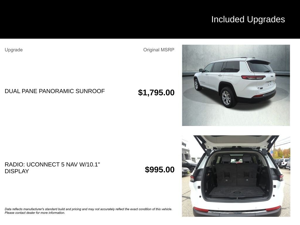 The Grand Cherokee L Limited's spacious and versatile interior offers seating for up to seven passengers, with a split-folding third-row seat for added flexibility. Indulge in the comfort of the Dual-Pane Panoramic Sunroof, which floods the cabin with natural light and enhances the sense of openness.