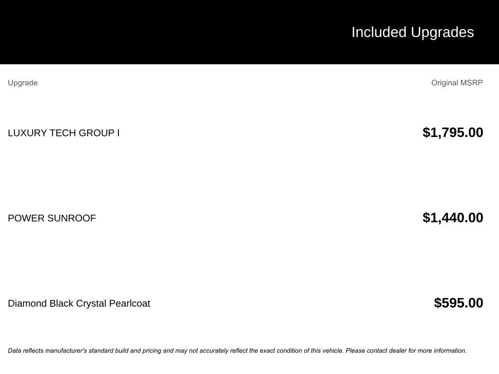 - LUXURY TECH GROUP I: Includes Selectable Tire Fill Alert, Remote Start System, Secondary Active Grille Shutters, 115V Auxiliary Power Outlet, Rain Sensitive Windshield Wipers, Wireless Charging Pad, Heated Front Seats, Heated Steering Wheel, Power Liftgate $1545.00 Added Value!