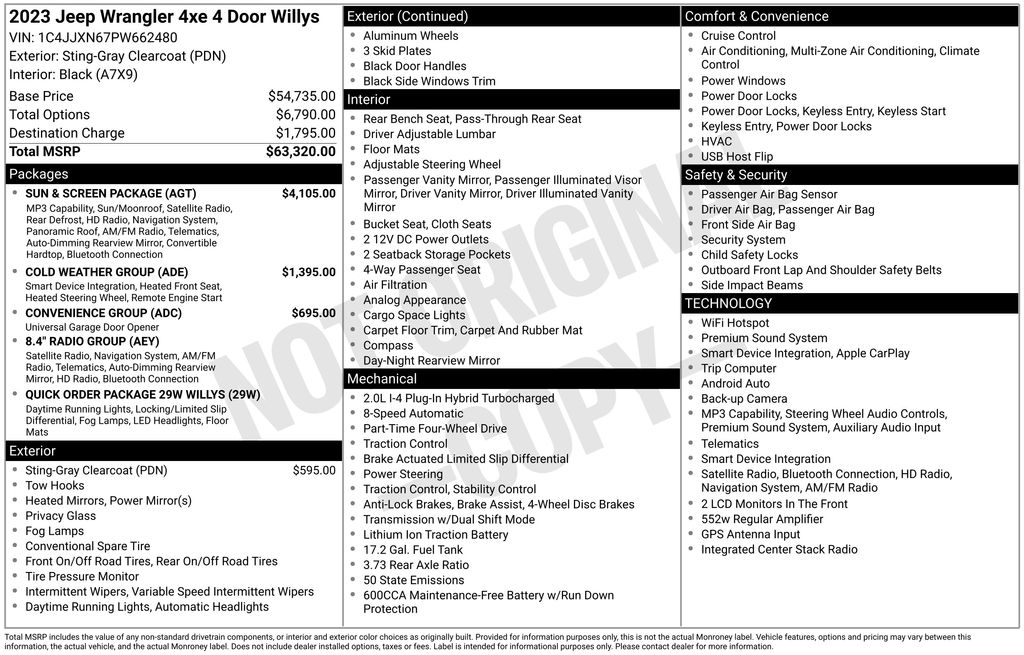 Experience the perfect blend of capability, technology, and comfort in the 2023 Jeep Wrangler Base 4xe. Visit our showroom today and let us demonstrate how this exceptional vehicle can enhance your driving experience.