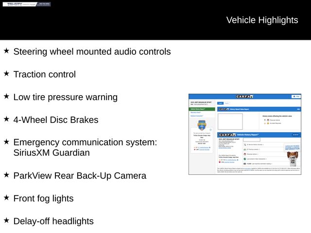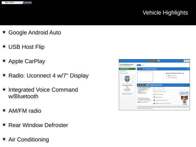 This Wrangler Sport is not just a capable off-road companion; it's also packed with a wealth of cutting-edge features that will elevate your driving experience. Enjoy seamless connectivity with Apple CarPlay and Google Android Auto, allowing you to access your favorite apps and stay connected on the go. The Uconnect 4 system with a 7-inch display puts intuitive controls at your fingertips, while the integrated voice command with Bluetooth technology ensures hands-free convenience.