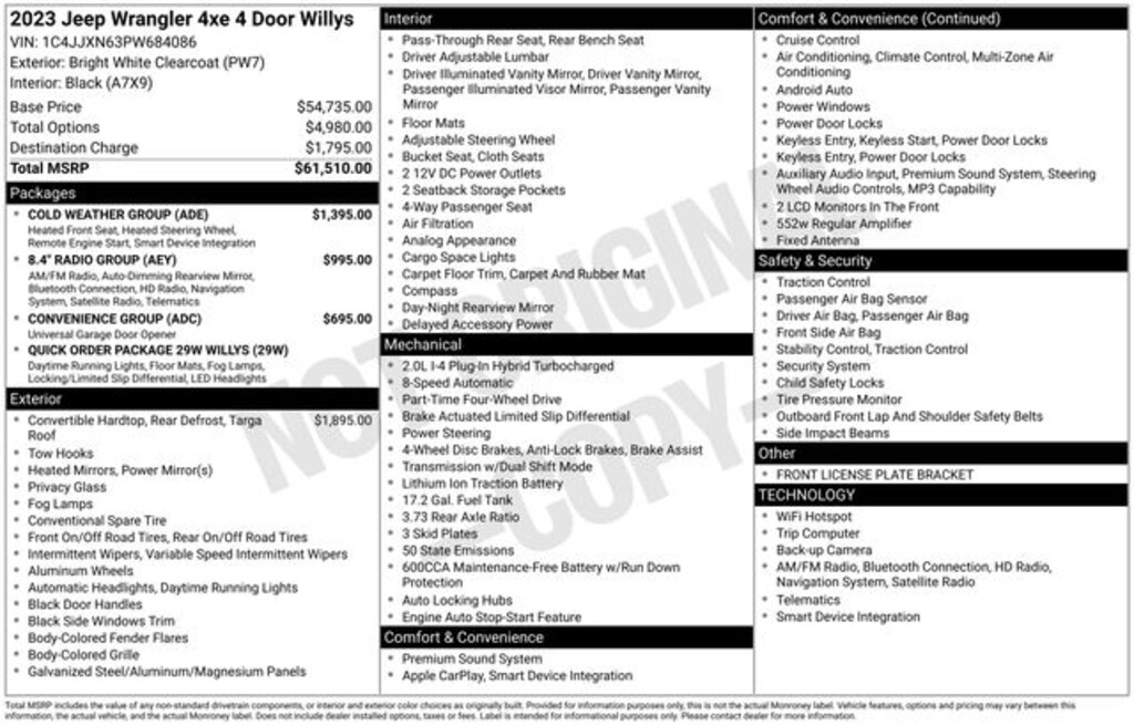 Discover the true essence of adventure in the 2023 Jeep Wrangler Base 4xe. Visit our showroom today and let us demonstrate how this exceptional SUV can transform your driving experience. We're confident you'll be captivated by its uncompromising performance, innovative technology, and unrivaled versatility. Take the first step towards owning a piece of off-road history â" the Wrangler Base 4xe is waiting to embark on your next great adventure.