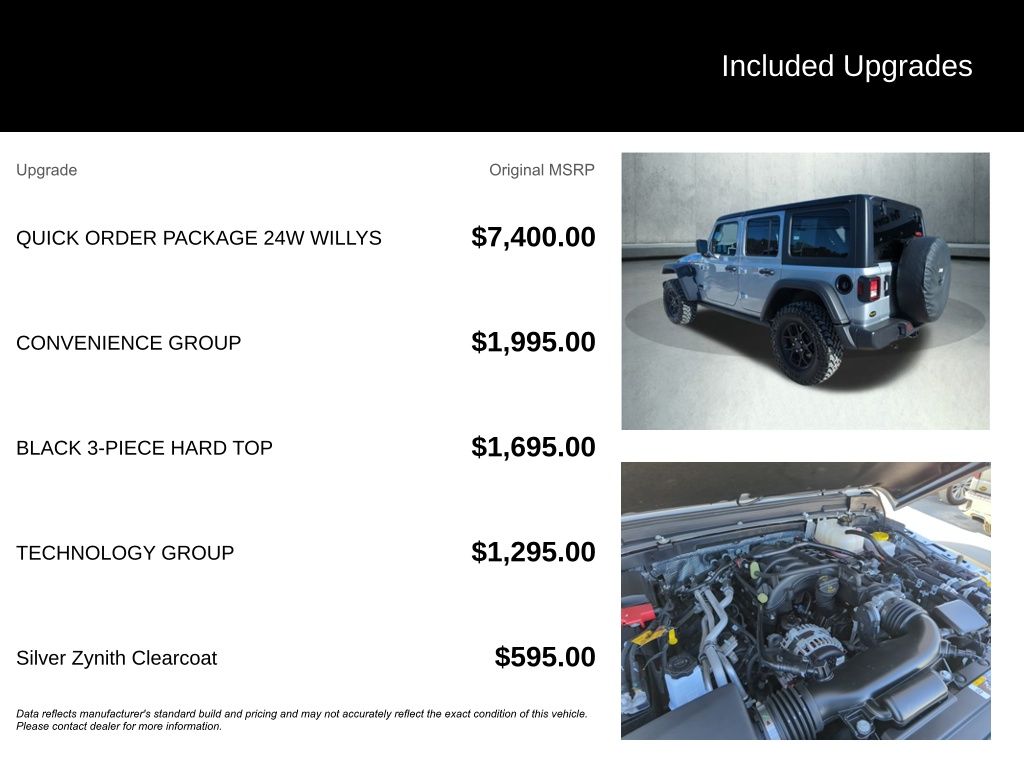 Powered by a robust 3.6L V6 engine mated to an 8-speed automatic transmission, the Wrangler Willys delivers impressive performance and exceptional 4WD capability. Conquer the toughest terrain with features like the Dana M210 Wide HD Tube Front Axle, Dana M220 Wide Rear Axle, and E-Locker Rear Axle. The Corning Gorilla Glass and Molded in Color Rubicon Highline Flare add both durability and style to this rugged SUV.