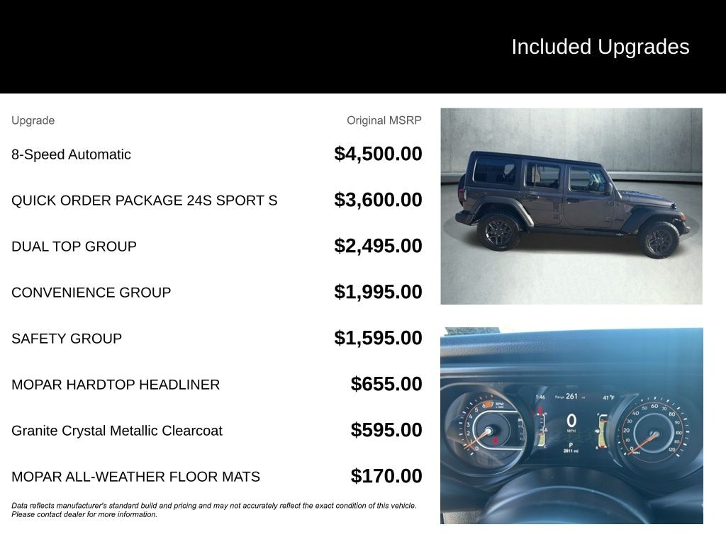 Step inside the Wrangler Sport S and experience the perfect blend of ruggedness and refinement. The Uconnect 5 infotainment system with a 12.3-inch display provides seamless connectivity, while the Cluster 7.0" TFT Color Display keeps you informed with vital vehicle data. The Convenience Group adds even more comfort and convenience, with features like Heated Front Seats, Heated Steering Wheel, and Remote Start System.