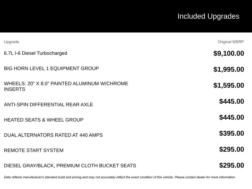 - Big Horn Level 1 Equipment Group, Cold Weather Group, Heated Seats & Wheel Group, Heavy Duty Snow Plow Prep Group, and Protection Group