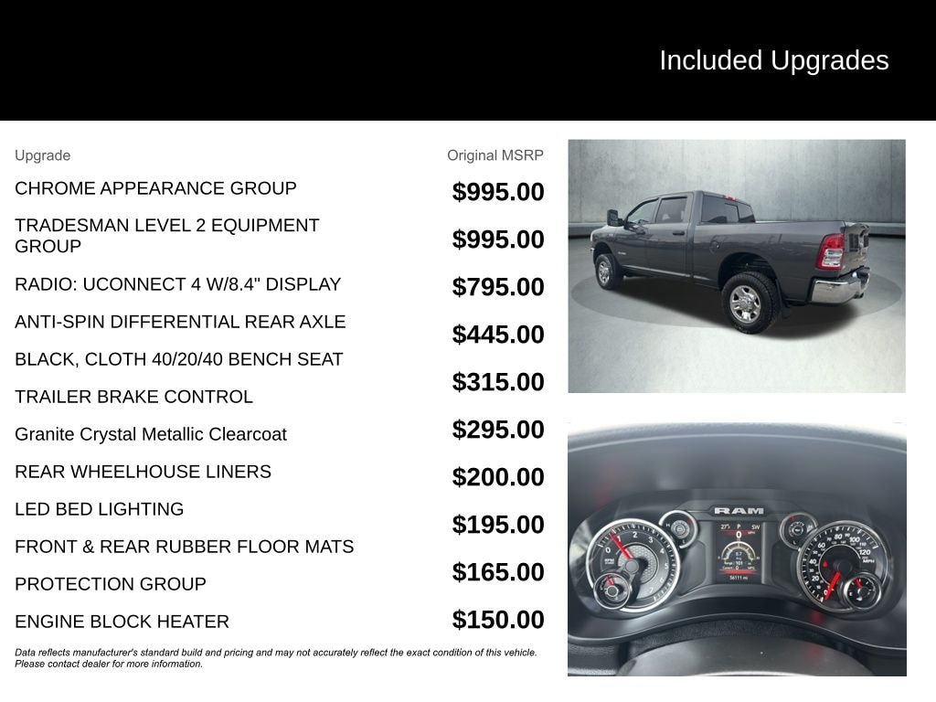 The exterior of this Ram 2500 is dressed in a sleek Granite Crystal Metallic Clearcoat, complemented by chrome accents that give it a bold, confident presence. Step inside and you'll find a spacious and well-appointed cabin, featuring a 40/20/40 split bench seat with front armrest and cupholders, providing both comfort and utility.