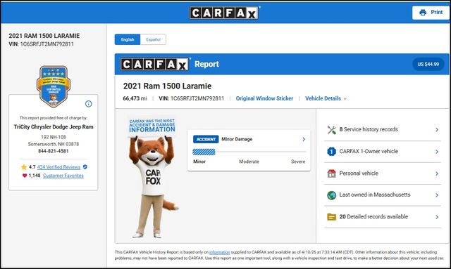 Powered by the legendary HEMI 5.7L V8 engine, this Ram 1500 Laramie delivers exceptional performance and capability. With 4-wheel drive and an 8-speed automatic transmission, you'll conquer any terrain with confidence. The impressive fuel economy, with 15 city and 21 highway MPG, ensures you can go the distance without compromising on power.