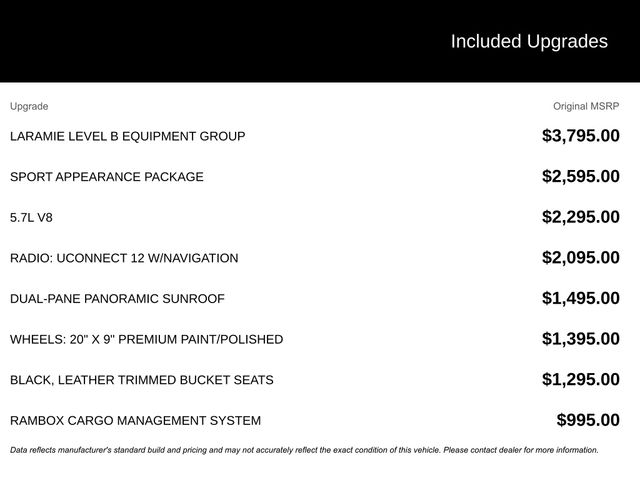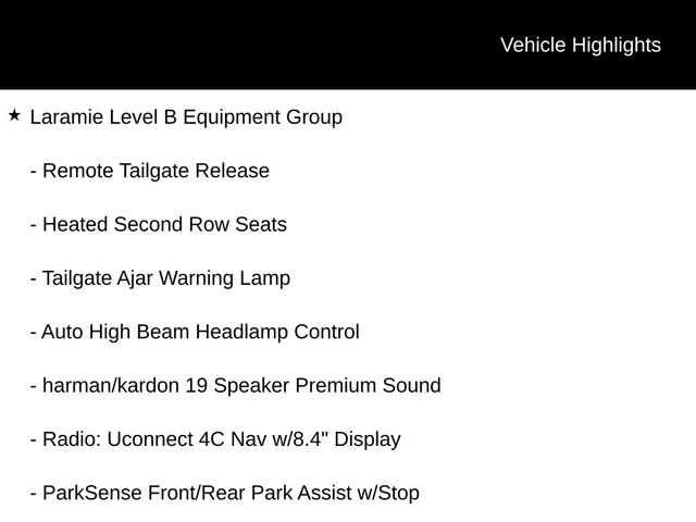 - LARAMIE LEVEL B EQUIPMENT GROUP: Enjoy the convenience of remote tailgate release, the immersive sound of the harman/kardon 19-speaker premium audio system, and the added security of front and rear park assist with stop. $3795.00 Added Value!