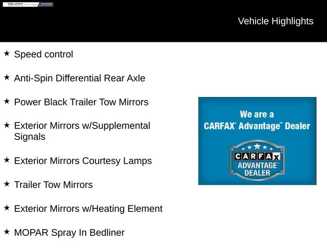 - AM/FM radio, Radio data system, Air Conditioning, Power windows, Rear Folding Seat, Traction control, 4-Wheel Disc Brakes, Low tire pressure warning, Remote Keyless Entry w/All-Secure, Brake assist, Electronic Stability Control, ParkView Rear Back-Up Camera, Fully automatic headlights, Speed control, Exterior Mirrors Courtesy Lamps, Exterior Mirrors w/Heating Element, Exterior Mirrors w/Supplemental Signals, Heated door mirrors, Power Black Trailer Tow Mirrors, Trailer Tow Mirrors, Cloth 40/20/40 Bench Seat, Class IV Receiver Hitch, Trailer Brake Control, 17" x 7" Aluminum Wheels
