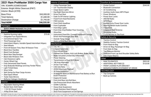 Don't settle for less â" experience the power, capability, and convenience of this 2021 Ram ProMaster 3500 High Roof. Schedule a test drive today and see for yourself why it's the ideal choice for your business.