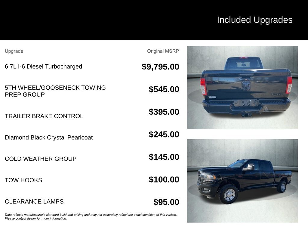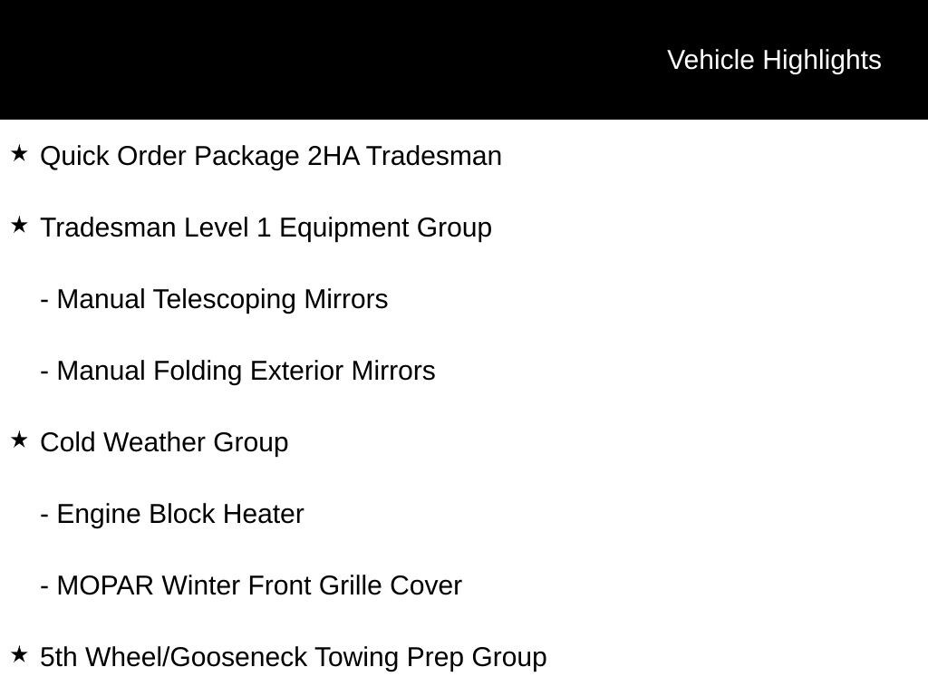2024 Ram 2500 Tradesman 17" x 7.5" Steel Styled Wheels, 3.73 Axle Ratio, 5th Wheel/Gooseneck Towing Prep Group, Cold Weather Group, Delay-off headlights, Electronically Controlled Throttle, Emergency communication system: SiriusXM Guardian, Engine Block Heater, Fully automatic headlights, Integrated Voice Command w/Bluetooth, Manual Folding Exterior Mirrors, Manual Telescoping Mirrors, ParkView Rear Back-Up Camera, Quick Order Package 2HA Tradesman, Radio: Uconnect 3 w/5" Display, Rear Folding Seat, Tradesman Level 1 Equipment Group, Trailer Brake Control, Trailer Light Check. CARFAX One-Owner. Clean CARFAX.