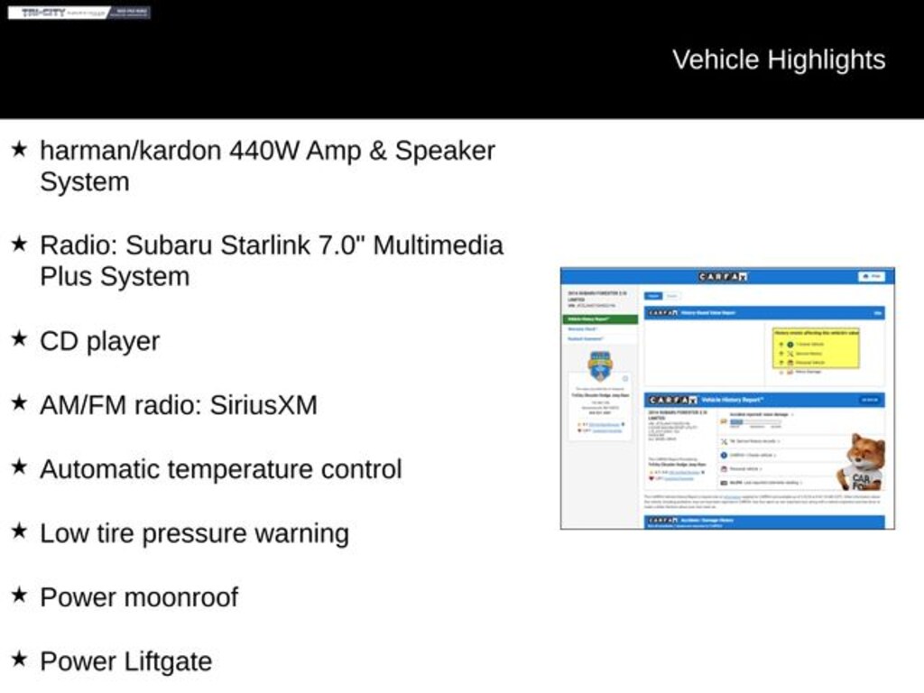 Step inside and experience the thoughtful design that sets this Forester apart. Enjoy the convenience of the power liftgate, the comfort of the heated front seats, and the premium sound of the Harman/Kardon audio system. The Subaru Starlink infotainment system keeps you connected and entertained, while the power moonroof adds an open-air feeling to your drives.