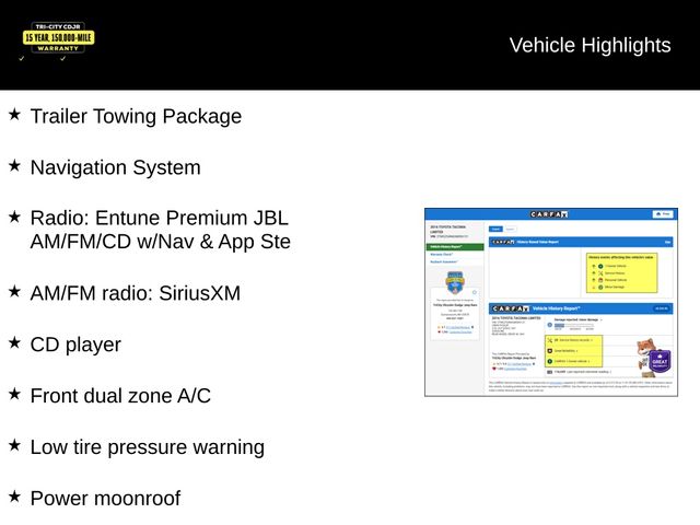 - Prjctr Beam Hdlghtsw/LED DRL & Fog Lghts - Pwr Side Mirrors w/Turn Sgnl Indicators - 5' Composite Bed w/120V Pwr Outlet - Deck Rail System w/4 Adj Tie-Down Cleats - Easy Lower,Lockable & Removable Tailgate INTERIOR - Smrt Key Sys on Dr Door w/Push Btn Strt & Remote Keyless Entry Sys - Lthr Trim Seats w/Htd Dr&Fr Pass Seats - Lthr Trim Steering Wheel w/Audio Cntrls - Pwr Wndws w/Fr Dr & Pass Auto Up/Dwn and Power Door Locks - Power Moonroof - Frnt Dual Zone A/C w/Indiv Temp Controls - Entune Prem JBL Audio w/Integ Nav App Ste: 7"Hi-Res Tch Screen, BT AM/FM/CD/USB/AUX,HDRad & SXM w/3mo Trial - Qi-compatible Wireless Smrtphone Chrgng