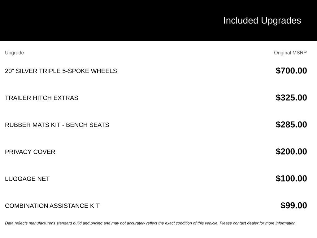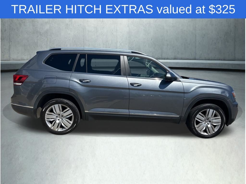 - TRAILER HITCH EXTRAS: Hitch ball and mount (5,000 lb, tow capacity) and 7-pin adapter plug - LUGGAGE NET: For securing items in the cargo area $100.00 Added Value! - RUBBER MATS KIT - BENCH SEATS: Set of 5 Monster Mats w/logo, Heavy Duty Trunk Liner w/VW CarGo Blocks $285.00 Added Value! - PRIVACY COVER: Tonneau privacy cover for cargo area - COMBINATION ASSISTANCE KIT: First Aid Kit, Roadside Assistance Kit, booster cables, warning triangle, LED flashlight, work gloves, multi-tool and more - 20" SILVER TRIPLE 5-SPOKE WHEELS: Wheels: 20" Silver Triple 5-Spoke Alloy, Tires: 20" All-Season $700.00 Added Value!